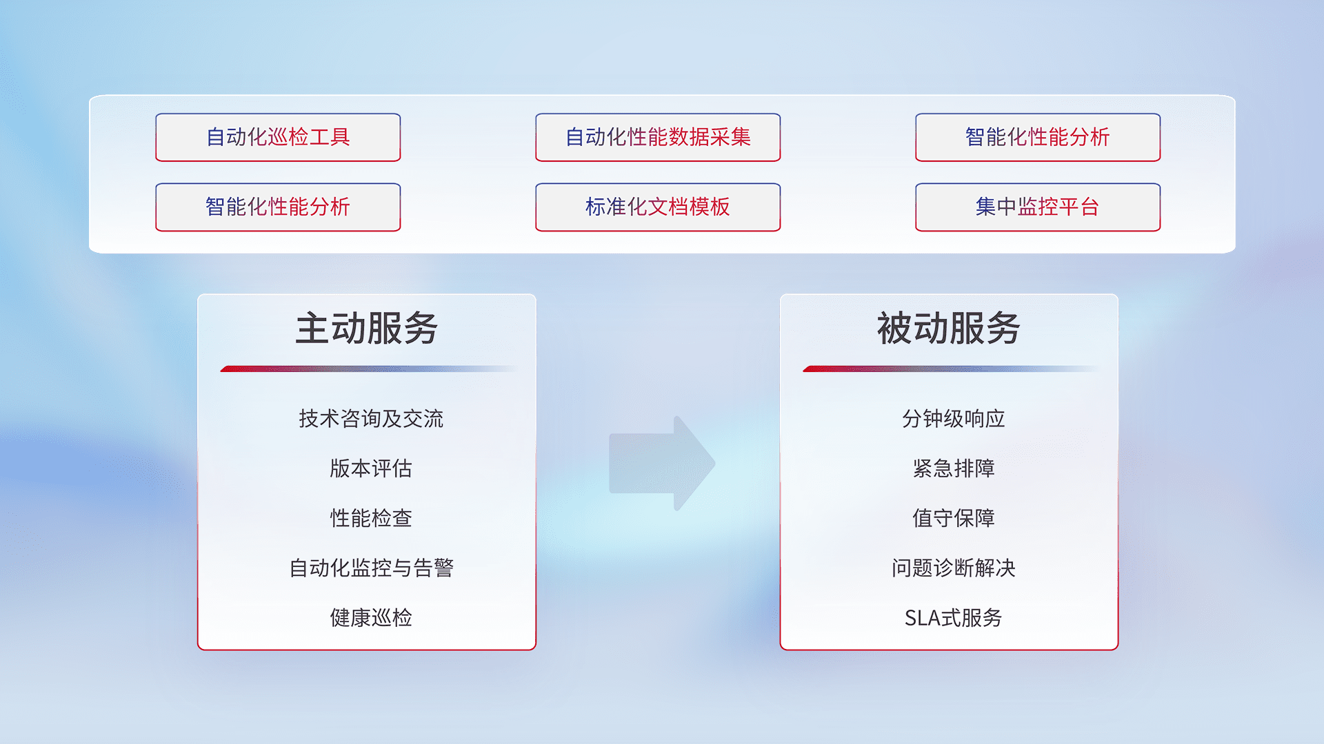 智能化工具和标准化文档,,保障服务质量,,提供主动服务(包含技术咨询、、、、版本评估、、、、性能检查、、、、自动化监控与告警、、、健康巡检)和被动服务包含(分钟级响应、、、紧急排障、、、、值守保障、、、问题诊断解决、、、、SLA服务)。。。。